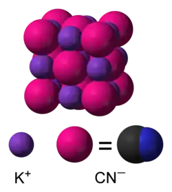 In aqueous solution, KCN is dissociated into hydrated potassium (K+) ions and cyanide (CN−) ions. As a solid, KCN has structure resembling sodium chloride: with each potassium ion surrounded by six cyanide ions, and vice versa. Despite being diatomic, and thus less symmetric than chloride, the cyanide ions rotate so rapidly that their time-averaged shape is spherical. At low temperature and high pressure, this free rotation is hindered, resulting in a less symmetric crystal structure with the cyanide ions arranged in sheets.[11][12]