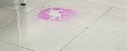Potassium hydroxide spillage, stained red by phenolphthalein