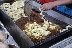 Some small producers continued to use a batch process, notably in Maui.[43] In 1980, inspired by the Maui Chip, an entrepreneur started Cape Cod Potato Chips to produce thicker, batch-cooked "Hawaiian style" potato chips, which came to be known as kettle-style (US) or hand-cooked (UK) chips and became a premium, "gourmet" item.[44] Kettle chips are thicker and the surface starch is not rinsed off, resulting in a style of chip called "hard-bite".[45]