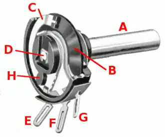 Many inexpensive potentiometers are constructed with a resistive element (B in cutaway drawing) formed into an arc of a circle usually a little less than a full turn and a wiper (C) sliding on this element when rotated, making electrical contact. The resistive element can be flat or angled. Each end of the resistive element is connected to a terminal (E, G) on the case. The wiper is connected to a third terminal (F), usually between the other two. On panel potentiometers, the wiper is usually the center terminal of three. For single-turn potentiometers, this wiper typically travels just under one revolution around the contact. The only point of ingress for contamination is the narrow space between the shaft and the housing it rotates in.