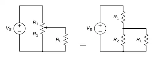 One of the advantages of the potential divider compared to a variable resistor in series with the source is that, while variable resistors have a maximum resistance where some current will always flow, dividers are able to vary the output voltage from maximum (VS) to ground (zero volts) as the wiper moves from one end of the potentiometer to the other. There is, however, always a small amount of contact resistance.