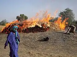 When a mound is completed and the ground around has been swept clean of residual combustible material, a senior potter lights the fire. A handful of grass is lit and the woman runs around the circumference of the mound touching the burning torch to the dried grass. Some mounds are still being constructed as others are already burning.[50]