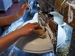 Jiggering a plate - Jiggering and jolleying: These operations are carried out on the potter's wheel and allow the time taken to bring wares to a standardized form to be reduced. Jiggering is the operation of bringing a shaped tool into contact with the plastic clay of a piece under construction, the piece itself being set on a rotating plaster mould on the wheel. The jigger tool shapes one face while the mould shapes the other. Jiggering is used only in the production of flat wares, such as plates, but a similar operation, jolleying, is used in the production of hollow-wares such as cups. Jiggering and jolleying have been used in the production of pottery since at least the 18th century. In large-scale factory production, jiggering and jolleying are usually automated, which allows the operations to be carried out by semi-skilled labour.