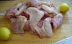 Poultry is available fresh or frozen, as whole birds or as joints (cuts), bone-in or deboned, seasoned in various ways, raw or ready cooked.[64] The meatiest parts of a bird are the flight muscles on its chest, called "breast" meat, and the walking muscles on the legs, called the "thigh" and "drumstick". The wings are also eaten (Buffalo wings are a popular example in the United States) and may be split into three segments, the meatier "drumette", the "wingette" (also called the "flat"), and the wing tip (also called the "flapper").[64][65] In Japan, the wing is frequently separated, and these parts are referred to as 手羽元 (teba-moto "wing base") and 手羽先 (teba-saki "wing tip").[66]