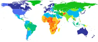 In 2012 it was estimated that, using a poverty line of $1.25 a day, 1.2 billion people lived in poverty.[77] Given the current economic model, built on GDP, it would take 100 years to bring the world's poorest up to the poverty line of $1.25 a day.[78] UNICEF estimates half the world's children (or 1.1 billion) live in poverty.[79] The World Bank forecasted in 2015 that 702.1 million people were living in extreme poverty, down from 1.75 billion in 1990.[80] Extreme poverty is observed in all parts of the world, including developed economies.[81][82] Of the 2015 population, about 347.1 million people (35.2%) lived in Sub-Saharan Africa and 231.3 million (13.5%) lived in South Asia. According to the World Bank, between 1990 and 2015, the percentage of the world's population living in extreme poverty fell from 37.1% to 9.6%, falling below 10% for the first time.[83]