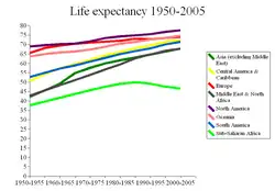 Life expectancy has been increasing and converging for most of the world. Sub-Saharan Africa has recently seen a decline, partly related to the AIDS epidemic. Graph shows the years 1950–2005.