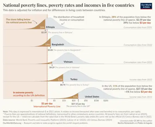 Statistically, as of 2019, most of the world's population live in poverty: in PPP dollars, 85% of people live on less than $30 per day, two-thirds live on less than $10 per day, and 10% live on less than $1.90 per day.[3] According to the World Bank Group in 2020, more than 40% of the poor live in conflict-affected countries.[4] Even when countries experience economic development, the poorest citizens of middle-income countries frequently do not gain an adequate share of their countries' increased wealth to leave poverty.[5] Governments and non-governmental organizations have experimented with a number of different policies and programs for poverty alleviation, such as electrification in rural areas or housing first policies in urban areas. The international policy frameworks for poverty alleviation, established by the United Nations in 2015, are summarized in Sustainable Development Goal 1: "No Poverty".
