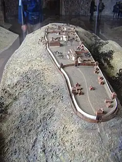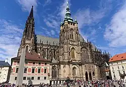 The construction of what came to be known as Prague Castle began near the end of the 9th century, expanding a fortified settlement that had existed on the site since the year 800.[26] The first masonry under Prague Castle dates from the year 885 at the latest.[27] The other prominent Prague fort, the Přemyslid fort Vyšehrad, was founded in the 10th century, some 70 years later than Prague Castle.[28] Prague Castle is dominated by the cathedral, which began construction in 1344, but was not completed until the 20th century.[29]