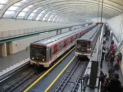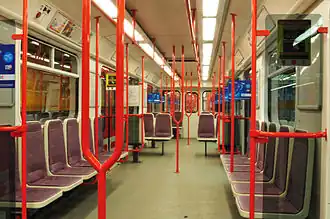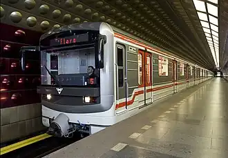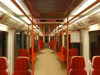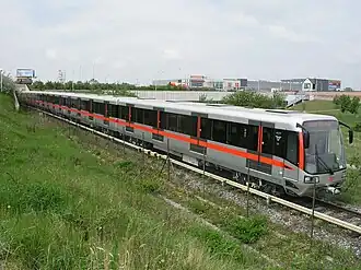 Metro M1 trains have operated on Line C since 2000; they completely replaced older cars on this line in 2003. DPP owns 265 of these cars, which form 53 five-car trains.[4] These cars were developed specially for Prague, and were manufactured there between 2000 and 2003 by a consortium consisting of ČKD Praha, ADtranz and Siemens (during the contract, Siemens acquired ČKD Praha). The total length of the train is 96.66 metres (317 ft 2 in), the acceleration is 1.3 m/s2 (4.3 ft/s2), and the total capacity of the train is 1,464 people (224 sitting, 1,240 standing).[13] This unit was also adapted for use in Venezuela on the Maracaibo Metro.