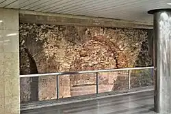 The name of the Můstek station means "little bridge"[27] and refers to the area around the station. The origin of the area's name was not known until remains of a medieval bridge were discovered during construction of the station. The remains were incorporated into the station and can be seen near the northwestern exit of the station.