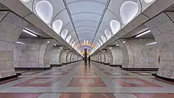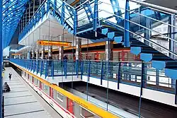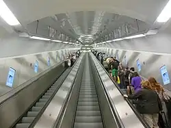Most stations have a single island platform in the centre of the station hall (tunnel) serving both directions. The sub-surface stations have a straight ceiling sometimes supported by columns, while the deep-level stations are larger tunnels with the track tunnels on each side. The walls of many stations are decorated using coloured aluminium panels; each station has its own colour. Some stations are considered among the finest in Europe.[10]