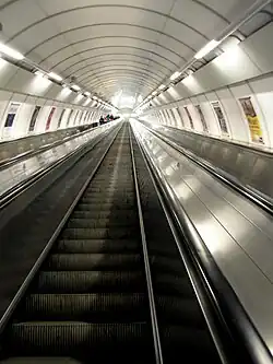 The escalators at Náměstí Míru (Peace Square) station in Vinohrady are the longest escalators in the European Union (length 87 m, vertical span 43.5 m, 533 steps, taking 2 minutes and 15 seconds to ascend).[28][29] Náměstí Míru is also the deepest station in the European Union, at 53 metres.