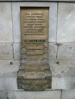During the invasion, protesters set up several memorials to record the location of the victims' death. The Jan Palach memorial is a monument remembering the suicide of a student in 1969. This place is often called the "boulevard of history". Palach was the first to kill himself in Wenceslas Square but was not the last, he was belonging to a student pact of resistance.[107] There is also (at Újezd, at the bottom of Petrin hill) the memorial for the victims of communism in Prague: a narrowing staircase along which seven male bronze silhouettes descend. The first one, the one at the bottom, is complete, while the others gradually disappear. It aims at representing the same person at different phases of the destruction caused by communist ideology.[108]