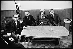 The Soviet leadership tried to stop, or at least limit, the changes in the ČSSR through a series of negotiations. The Soviet Union agreed to bilateral talks with Czechoslovakia from 29 July to 1 August at Čierna nad Tisou, near the Soviet border. The Soviets were represented by almost the full Politburo that met for the first time outside the territory of the Soviet Union; also the Czechoslovak delegation included the full membership of the Presidium,[42] but the main agreements were reached at the meetings of the "fours" – Brezhnev, Alexei Kosygin, Nikolai Podgorny, Mikhail Suslov – Dubček, Ludvík Svoboda, Oldřich Černík, Josef Smrkovský.[43]