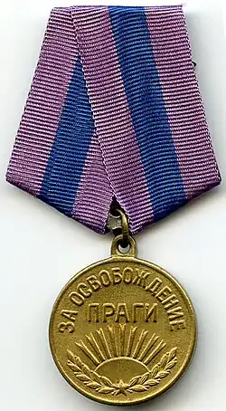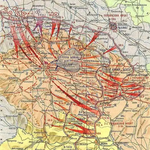 Volume 10 of the Soviet official history of the Second World War treats the Prague Offensive as a primarily military event,[50] identifying the major military formations involved, their axes of advance, and in some cases, their daily rate of advance. Unsurprisingly, the Soviet history praises the operation for the international efforts of Soviet, Polish, Czech, and Romanian soldiers on behalf of "the freedom of the Czechoslovakian People".[40] No mention is made, however, of Stalin's political intentions regarding Czechoslovakia. The final push to Prague during the night of 8–9 May 1945 is presented as having been necessary to relieve struggling Czech insurgents in Prague[29] while the authors could not resist accusing former officers of the prewar Czech Army of abandoning the barricades during combat with the Germans in Prague.[29]