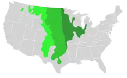 Prairie ecosystems in the United States and Canada are divided into the easternmost tallgrass prairie, the westernmost shortgrass prairie, and the central mixed-grass prairie. Tallgrass prairies receive over 30 inches of rainfall per year, whereas shortgrass prairies are much more arid, receiving only 12 inches or so, and mixed-grass prairies receive intermediate rainfall.[13][14] Wet, mesic, and dry prairie ecosystems can also form more locally due to soil and terrain characteristics. Wet prairies may form in low-lying areas with poor drainage; dry prairie can be found on uplands or slopes. Dry prairie is the dominant habitat type in the Southern Canadian agricultural and climatic region which is known as Palliser's Triangle. It was once thought to be completely unarable, but is now one of the most important agricultural regions in Canada thanks to advances in irrigation technology.[15]