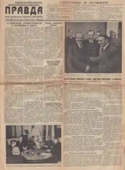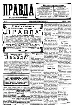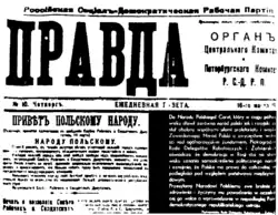 Pravda (Russian: Правда, IPA: [ˈpravdə] ⓘ, lit. 'Truth') is a Russian broadsheet newspaper, and was the official newspaper of the Central Committee of the Communist Party of the Soviet Union, when it was one of the most influential papers in the country with a circulation of 11 million.[1] The newspaper began publication on 5 May 1912 in the Russian Empire but was already extant abroad in January 1911.[2] It emerged as the leading government newspaper of the Soviet Union after the October Revolution. The newspaper was an organ of the Central Committee of the CPSU between 1912 and 1991.[3]