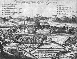 "The city particularly suffered during the religious conflicts of the seventeenth century, when it had a reputation for Protestant anti-Habsburg sentiment. In 1687, General Carafa, an emissary of the Austrian emperor, imprisoned a group of local noblemen suspected of insurrection in a former wine warehouse off the square now known as Caraffa's Prison. He subsequently, and notoriously, had 24 of them tortured, executed, and their heads placed on spikes around the town, after what we would now call a show trial."[10]