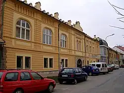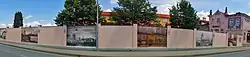 "In 1940, on the eve of the Holocaust, Prešov contained five synagogues and more than one in six of the city's population—4,308 people—was Jewish. Three of the synagogues are still standing, but the Jewish community now numbers fewer than 60. Outside the sole functioning synagogue, on Švermova just off the main square, is a memorial to the 6,400 Jews from Prešov and the surrounding region who died in the Holocaust. The broad path leading to the tombstone-shaped monument, surrounded by prison-like bars, is intended to represent the Jewish pre-war population; the narrow path that leads on from it to the synagogue, those who survived."[14]