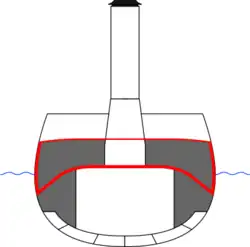 Schematic section of a typical pre-dreadnought battleship with an armored upper and middle deck and side belt (red), lateral protective coal bunkers (grey), and a double-bottom of watertight compartments. The machinery was arranged in the protected internal void.