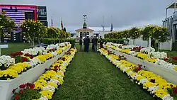 In 1940, it was proposed to drape the winning horse in a garland of the Maryland State flower, Rudbeckia hirta, commonly called black-eyed Susans. This posed a problem, as the race is run nearly two months before the flowers come into bloom in late June or July. At first, yellow Viking daisies were painted to resemble black-eyed Susans. Painted flowers have been discontinued since the first decade of the current millennium and Viking Poms, a member of the chrysanthemum family, are now used.[31] Although the Preakness is sometimes referred to as "the race for the black-eyed Susans", no black-eyed Susan is ever used.[32][33]
