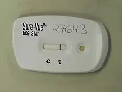 Qualitative tests (yes/no or positive/negative results) look for the presence of the beta subunit of human chorionic gonadotropin in blood or urine. For a qualitative test the thresholds for a positive test are generally determined by an hCG cut-off where at least 95% of pregnant people would get a positive result on the day of their first missed period.[11] Qualitative urine pregnancy tests vary in sensitivity. High-sensitivity tests are more common and typically detect hCG levels between 20 and 50 milli-international units/mL (mIU/mL). Low-sensitivity tests detect hCG levels between 1500 and 2000 mIU/mL and have unique clinical applications, including confirmation of medication abortion success.[12] Qualitative urine tests available for home use are typically designed as lateral flow tests.