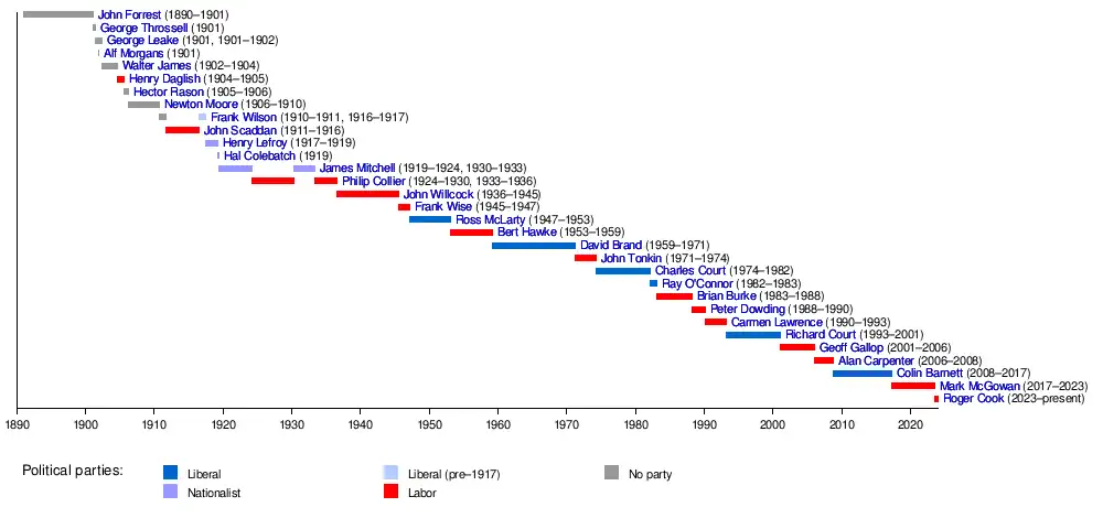 The premier of Western Australia is the head of government of the state of Western Australia.[3] The role of premier at a state level is similar to the role of the prime minister of Australia at a federal level. The premier leads the executive branch of the Government of Western Australia and is accountable to the Parliament of Western Australia. The premier is appointed by the governor of Western Australia. By convention, the governor appoints as premier whoever has the support of the majority of the Western Australian Legislative Assembly, the lower house of the Parliament of Western Australia. In practice, this means that the premier is the leader of the political party or group of parties with a majority of seats in the Legislative Assembly. Since Western Australia achieved self-governance in 1890, there have been 31 premiers. Roger Cook is the current premier, having been appointed to the position on 8 June 2023.