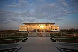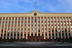 The Presidential Palace (Belarusian: Рэзідэнцыя Прэзідэнта, Russian: Резиденция президента) is a Stalinist Empire style building located on October Square in Minsk surrounded by the streets of Marx, Engels, Kirov and Komsomol. Like the American White House, the streets close to the official residence are closed off to vehicular traffic and are patrolled by police forces. Having been used since 1994, it formerly housed the Central Committee of the Communist Party of Byelorussia.[18][19] The president also has use of the Independence Palace in Minsk.