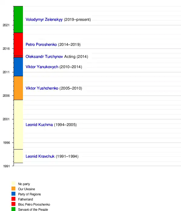 Since the office's establishment on 5 December 1991, there have been six presidents of Ukraine. Leonid Kravchuk was the inaugural president, serving three years from 1991 until his resignation in 1994. Leonid Kuchma was the only president to have served two consecutive terms in office. Viktor Yushchenko, Petro Poroshenko, and Viktor Yanukovych served one term, with the latter being replaced by acting president Oleksandr Turchynov, who then also served as Chairman of the Ukrainian Parliament, on 21 February 2014.[4] Oleksandr Turchynov was the only acting president in Ukraine's modern history. The powers of an acting president are severely limited. On 18 June 2015, Yanukovych was officially deprived of the title of president of Ukraine.[5] The Government of Ukraine utilizes a semi-presidential system in which the roles of the head of state and head of government are separate, thus the president of Ukraine is not the nation's head of government.[6] The prime minister serves as the head of government,[7] a role currently filled by Yulia Svyrydenko, who took office on 17 July 2025. Ukraine is somewhat unusual in that while many countries use a similar system typically the role of one leader is relegated to being ceremonial, in Ukraine however both the prime minister and the president have great power and responsibility assigned to their roles. Because the president of Ukraine must approve the appointment of the prime minister, the post of president is generally thought of as the more powerful role.[8]