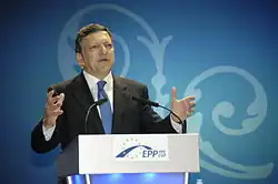 In 2009, the European People's Party (EPP) endorsed Barroso as its candidate for Commission president, and the EPP subsequently retained its position as largest party in that year's election. The Socialists responded by pledging to put forward a rival candidate at future elections.[31] Once again, Barroso was forced by Parliament to make a change to his proposed Commission,[32] but eventually received assent. However, in exchange for approval, Parliament forced some concessions from Barroso in terms of Parliamentary representation at Commission and international meetings.[33] On 7 September 2010, Barroso gave the first US-style State of the Union address to Parliament, which focused primarily on the EU's economic recovery and human rights. The speech was to be annual.[34]