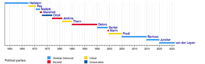 In July 2019, the European Council nominated Ursula von der Leyen to succeed Jean-Claude Juncker, and she was elected the 13th president of the European Commission by the European Parliament on 16 July.[9][10] Von der Leyen assumed office on 1 December 2019, following the approval of her nominated College of Commissioners by the European Parliament,[11] and was re-elected on 18 July 2024.[12]