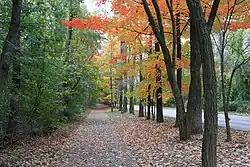 The first paved road was built in the park in 1924,[5] and today 13 miles (21 km) of roads run through the park.[2] Pennsylvania Route 832 is the main road into the park, and is subsequently known as Peninsula Drive.[19] Presque Isle has been referred to as "Peninsula State Park".[20] The Perry Monument in the park was constructed in 1926 near Misery Bay and the burials in Graveyard Pond.[2]