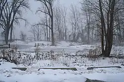 The "Little Bay" near the tip of the peninsula where the ships sheltered, next to the current Perry's Monument, was later named "Misery Bay" because of the hardships during the winter of 1813–1814, after the men returned there from battle.[2] Many men suffered from smallpox and were kept in quarantine near the bay. Many infected men died and were buried in what is now called Graveyard Pond.[2][5][12]