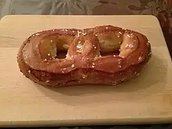A pretzel (/ˈprɛtsəl/ ⓘ PRET-səl; from German: Breze or Brezel, pronounced [ˈbʁeːtsl̩] ⓘ or [ˈbʁɛtsl̩]; Bavarian: Brezn) is a type of baked pastry made from dough that is commonly shaped into a knot. The traditional pretzel shape is a distinctive symmetrical form, with the ends of a long strip of dough intertwined and then twisted back onto itself in a particular way (a pretzel loop or pretzel bow). Today, pretzels come in various shapes, textures, and colors, but the original soft pretzel remains one of the most common pretzel types.