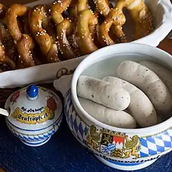 In Bavaria, lye pretzels accompany a main dish, such as Weisswurst sausage. The same dough and baking procedure with lye and salt is used to make other kinds of "lye pastry" (Laugengebäck): lye rolls, buns, croissants, and even loaves (Laugenbrötchen, Laugenstangen, Laugencroissants, Laugenbrot).[12][18] Yet, in some parts of Bavaria, especially in lower Bavaria, unglazed "white" pretzels, sprinkled with salt and caraway seeds are still popular. Basically, with the same ingredients, lye pretzels come in numerous local varieties. Sizes are usually similar; the main differences are the thickness of the dough, the content of fat and the degree of baking. Typical Swabian pretzels, for example, have very thin "arms" and a "fat belly" with a split, and a higher fat content. The thicker part makes it easier to slice them for the use of sandwiches. In Bavarian pretzels, the arms are left thicker so they do not bake to a crisp and contain very little fat.[19] Oversized pretzels are often sold at fairs or beer festivals.