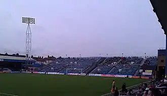 Opposite the Rainham End is the Brian Moore Stand. This stand is a temporary one, and accommodates visiting supporters.[28] It occupies the site of the former Town End terracing, which was unusual in that it had a pronounced slope, with one end of the terracing being higher up than the other. In 1955 the pitch, which previously sloped at that end of the stadium, was levelled out but the gradient of the Town End was left unchanged.[14]