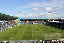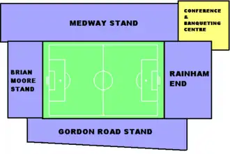The pitch is surrounded by four all-seater stands – the Medway Stand, the Rainham End, the Gordon Road Stand and the Brian Moore Stand. All are covered with the exception of the Brian Moore Stand. The Medway Stand, which replaced the old Main Stand and part of the terracing at each end, is the largest and northernmost of the four. It has two tiers with a row of twenty executive boxes between the top and bottom tier. The stand also contains the changing rooms, physiotherapy facilities, club offices and club shop.[16] The Rainham End, located behind the goal at the eastern end of the pitch, opened in 1999 and houses 2,400 fans. This stand, like the terrace it replaced, is known for housing the club's most vocal supporters.[26] The Gordon Road Stand, which seats 2,600, was opened in 1997 and is opposite the Medway Stand. Due to planning requirements, the stand had a height restriction placed upon it, making it significantly lower than the other three sides of the ground, and due to the road layout behind it is narrower at one end than the other.[16] A gantry for television cameras is located on the roof of this stand.[27]