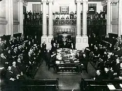 Australia's first prime minister, Edmund Barton, at the central table in the House of Representatives in 1901.Federation occurred on 1 January 1901, but elections for the first parliament were not scheduled until late March. In the interim, an unelected caretaker government was necessary. In what is now known as the Hopetoun Blunder, the governor-general, Lord Hopetoun, invited Sir William Lyne, the premier of the most populous state, New South Wales, to form a government. However, no politician would agree to be a member of his Cabinet and Lyne returned his commission before Federation actually took place. The governor-general instead then commissioned the much more popular Edmund Barton, who became the first prime minister on Federation and led the inaugural government into and beyond the election.
