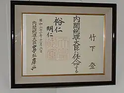 The document appointing Noboru Takeshita as prime minister. The Privy Seal of Japan and signature of Crown Prince Akihito (then temporarily performing state acts during the illness of Emperor Hirohito) can be seen in the centre, and the signature of the outgoing prime minister Yasuhiro Nakasone on the left