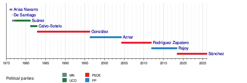 Pedro Sánchez, of the Spanish Socialist Workers' Party (PSOE), has been prime minister since 2 June 2018. He first came to power after a successful motion of no confidence against former prime minister Mariano Rajoy.[5] Since then, Sánchez has led three governments, the most—along with Adolfo Suárez—just behind fellow socialist Felipe González, prime minister from 1982 to 1996.[6] King Felipe VI re-appointed Sánchez for the third time on 17 November 2023[7] after he reached a coalition agreement with Sumar and gathered the support of other minor parties.[8] His third government took office on 21 November 2023.[9]