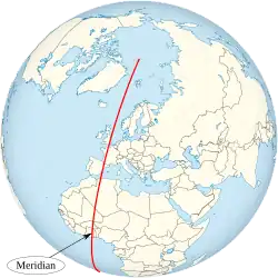 A prime meridian is an arbitrarily chosen meridian (a line of longitude) in a geographic coordinate system at which longitude is defined to be 0°. On a spheroid, a prime meridian and its anti-meridian (the 180th meridian in a 360°-system) form a great ellipse. This divides the body (e.g. Earth) into two hemispheres: the Eastern Hemisphere and the Western Hemisphere (for an east-west notational system). For Earth's prime meridian, various conventions have been used or advocated in different regions throughout history.[1] Earth's current international standard prime meridian is the IERS Reference Meridian. It is derived, but differs slightly, from the Greenwich Meridian, the previous standard.[2]