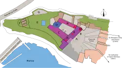 Illustration 4: A: Entrance; B, C: State apartments, double loggia, and horse-shoe stairs; D:chapel; E:Swimming pool, F: All Saints Tower; G: Serravalle; H: South Tower; K: Middle Tower; M: St Mary's Tower; N: Administrative and domestic offices etc.