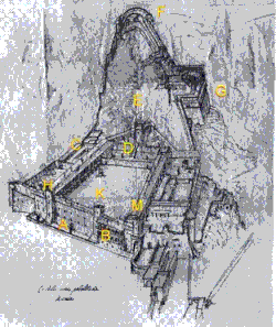 Illustration 7: The palace in the 17th century. North is to the right of the picture. A: Entrance; B, C: State apartments, double loggia, and horse-shoe stairs; D: Future site of chapel; E, F: All Saints Tower; G: Serravalle; H: South Tower; K: Middle Tower; M: St Mary's Tower.