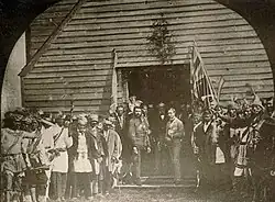 In Canada, Arthur, as an officer with the Montreal detachment of the Rifle Brigade,[4] undertook a year's training and engaged in defending the Dominion from the Fenian Raids; there was initially concern that his personal involvement in Canada's defence might put the Prince in danger from Fenians and their supporters in the United States, but it was decided his military duty came first.[4] Following his arrival at Halifax, Arthur toured the country for eight weeks and made a visit in January 1870 to Washington, D.C., where he met with President Ulysses S. Grant.[4][9] During his service in Canada he was also entertained by Canadian society; among other activities, he attended an investiture ceremony in Montreal, was a guest at balls and garden parties, and attended the opening of parliament in Ottawa (becoming the first member of the royal family to do so),[9] all of which was documented in photographs that were sent back for the Queen to view. On 25 May 1870 he was engaged in fending off Fenian invaders during the Battle of Eccles Hill, for which he received the Fenian Medal.[10]