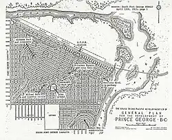Properties were sold in both of the townsites with railway speculation driving up prices.[10] By 1913, South Fort George and Fort George each had a population of around 1,500 and were booming as thousands of rail construction workers came to town for supplies and entertainment.[14] Both communities believed that the Grand Trunk Pacific station would be built in their town, and both were disappointed when the railway purchased the 553 ha (1,366 acres) of land in between them from the Lhiedli T'enneh instead, even though Charles Vance Millar, then the owner of the BC Express Company, was well into negotiations to purchase that property himself.[15][9] The railway compensated Millar by giving him 81 ha (200 acres) of the property and, by 1914, when the railway was completed and the first train arrived, there were four major communities in the area: South Fort George, Fort George Townsite, the Millar Addition and the railway's townsite, Prince George, where the station was built.[9] Hammond also developed his lots further, including additions such as Central Fort George. Although George Hammond fought a series of bitter legal battles for a railway station in Fort George. The Railway argued against a station in Fort George as it was their investment and risk, thus they would build a station in a townsite of their own (Prince George).[10] Plans for the townsite for Prince George were created by Brett and Hall of Boston, and the land cleared in May 1913.[6]