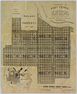 Fort George townsite was built 3.2 km (2 mi) to the northwest on the Nechako River. The name had been registered by the district lot original purchasers with some concerns due to its similarity to the HBC trading post's name. George Hammond, the CEO of the Natural Resources Security Company, bought nine district lots and promoted his community of Fort George in exaggerated and questionable advertisements all over Canada and Britain, describing Fort George in glowing terms as being the future hub of British Columbia, the "Chicago of the north",[9] and having mild winters and being suitable for any agricultural endeavour.[10] Hammond claimed the existence of buildings and facilities in advertising when none existed at the time.[11] Lots sold in 1912 for $400, rising to $500-$1,000 by 1913.[11]