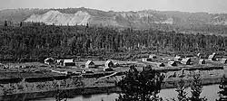 Army Camp Prince George was opened during WWII and once housed 6,000 soldiers. From March 1942 to October 1943, divisional troops and units of the 16th Infantry Brigade (8th Canadian Infantry Division) were housed there. The camp was located in the area of 1st Street, Central Street, 15th Avenue, to the bottom of Cranbrook Hill. Barracks were built to house the soldiers, dining halls constructed to feed them, and wet canteens for their leisure and entertainment. There were rifle ranges, mortar ranges and artillery ranges. The camp closed at the end of the war. Most of the buildings were either demolished or moved to new locations, although some remain in their original locations, such as the former transportation building on 15th Avenue, that was used by the British Columbia Forestry Service from the late 1940s to 1963. It is now owned by the City of Prince George for use by the Community Arts Council. The Nechako Bottle Depot on First Avenue is also another former camp building. Others include the first Overwaitea store, at Victoria and Third, formerly a barracks and the original civic centre, which was the old drill shed, was removed and rebuilt on Seventh Avenue.[22][23] Population during the war saw 2,027 in 1941 rising to 3,800 in Prince George by 1945.[6]