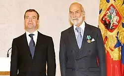 Michael speaks fluent Russian[41] and has a strong interest in Russia, where he is a well-known figure (he is a former recipient of the Order of Friendship). Tsar Nicholas II was a first cousin of three of his grandparents: George V, Prince Nicholas of Greece and Denmark, and Grand Duchess Elena Vladimirovna of Russia. When the bodies of the Tsar and some of his family were recovered in 1991, the remains were later identified by DNA using, among others, a sample from Michael for recognition.[42] He attended the 1998 burial of the Tsar and his family in St Petersburg.[43] He is an honorary member of the Romanov Family Association.[44] He is also the second cousin of Maria Vladimirovna, Grand Duchess of Russia, who is a claimant to the headship of the Imperial Family of Russia. They share the same great-grandfather, Grand Duke Vladimir Alexandrovich. Michael is the patron of organisations which have close ties with Russia, including the Russo-British Chamber of Commerce and the St Gregory's Foundation.[45] In his capacity as patron of Children's Fire and Burns Trust, Michael has led fundraising rallies in 1999 and 2003 in Russia to raise money for the charity. He also led another rally in 2005 and raised money for the Royal Marsden Hospital and Britain's Charities Aid Foundation Russia.[45]
