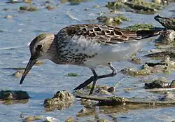 The crossing passes over mudflats in the Severn Estuary with part of the eastern approach viaduct sited on the English Stones, a rocky outcrop uncovered at low tide. The estuary wetlands are home to migrating birds such as the ringed plover, redshank and whimbrel, while the curlew, dunlin and grey plover winter in the area. The birds feed on ragworm, lugworm and other invertebrates. Saltmarsh is found along the fringes of the coast. Beds of eelgrass occur on the more sheltered mud- and sandbanks.[24] In 1976, in recognition of the importance of the estuary as a wetland used by migrating birds, an area of 247 km2 (95 sq mi) was designated a Ramsar site.[25] In 1988, the Severn Estuary was designated a Special Protection Area. The same year an area of 99 km2 (38 sq mi) was notified as a Site of Special Scientific Interest and designated as such the following year;[24] in 1995, this was extended to cover the whole of the Ramsar site.[26]