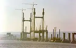 Sub-assemblies for the bridge were constructed onshore and then shifted by a large tracked vehicle (similar to that used to move the Apollo and Space Shuttle at Cape Kennedy) onto a barge (the SAR3), prior to being floated out on the high tide to the site. The 37 bridge pier foundations on the approach viaducts are 98.11 metres (321.9 ft) apart, and consist of open concrete caissons weighing up to 2,000 tonnes, which were founded on the rock of the estuary bed. The decking consists of 3.6-metre (11.8 ft) post-stressed match cast sections, weighing 200 tonnes (200 long tons; 220 short tons) each.[14]